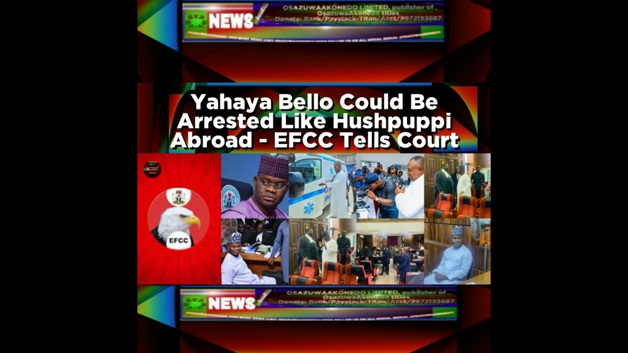 Yahaya Bello Could Be Arrested Like Hushpuppi Abroad - EFCC Tells Court https://ift.tt/dU570Hq #EFCC #Kogi #Abuja #Bello #Dubai #UK #US ©June 29th, 2025 ®June 29, 2025 5:32 pm Nigeria anti corruption police, the Economic and Financial Crimes Commission, EFCC has told a Federal High Court sitting in Abuja that the immediate past Governor of Kogi State, Yahaya Bello is on International red alert or on the watchlists of Security Operatives abroad and if left to travel abroad for medical treatment, he could be arrested like the way and manner a Nigerian social media influencer and United States, US convicted fraudster, Ramon Abba aka Hushpuppi was arrested, adding, the charges against the ex governor are connected to buildings he allegedly owned in Dubai and bank transactions in the US and United Kingdom, UK, praying the court to order Yahaya Bello to undergo the medical treatment in the ultra modern hospital the ex governor had boasted he built in Kogi State. #OsazuwaAkonedo